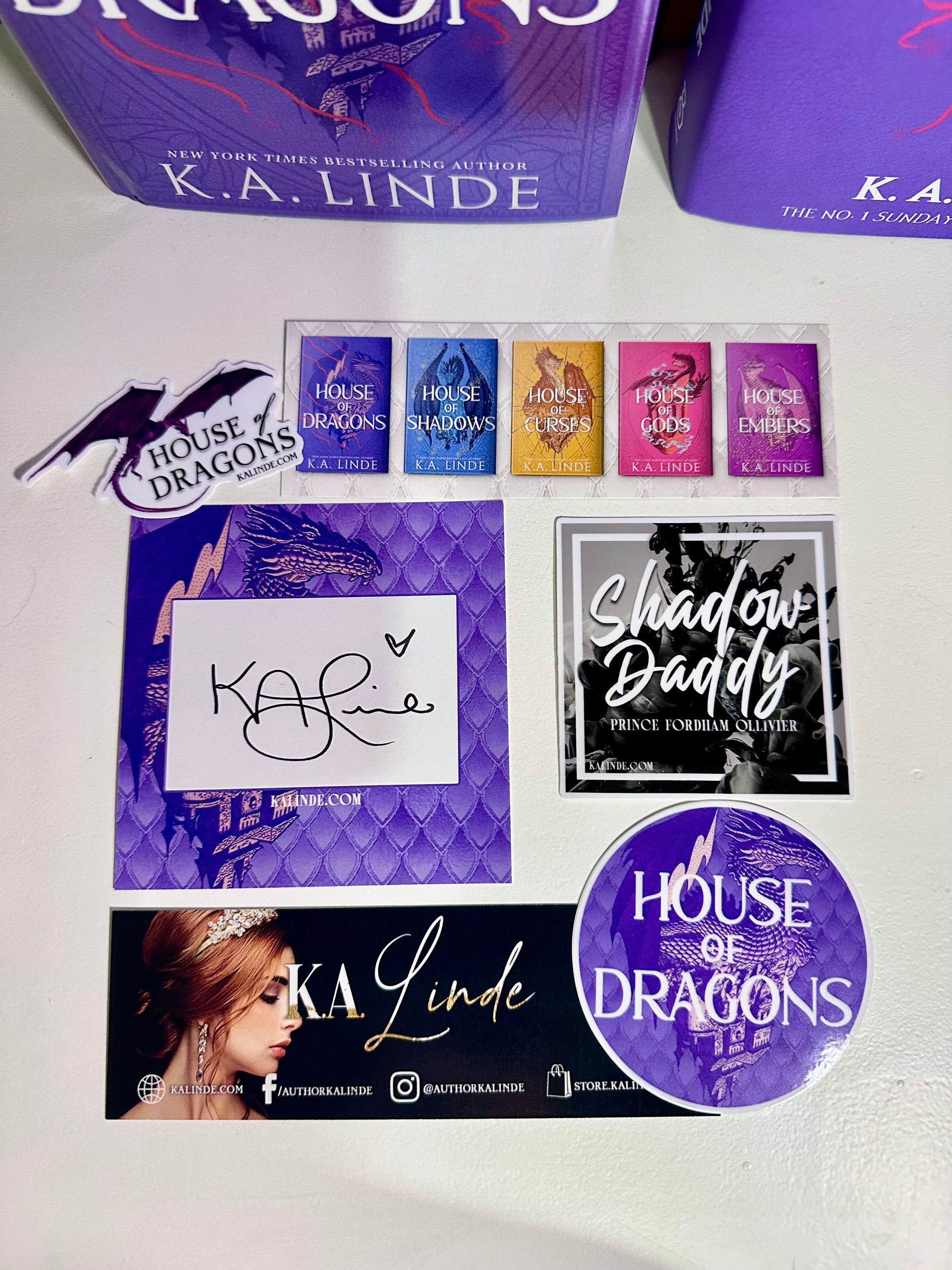 House of Dragons Swag Pack includes: 3 stickers, a book plate, and a bookmark.